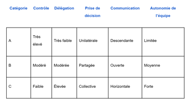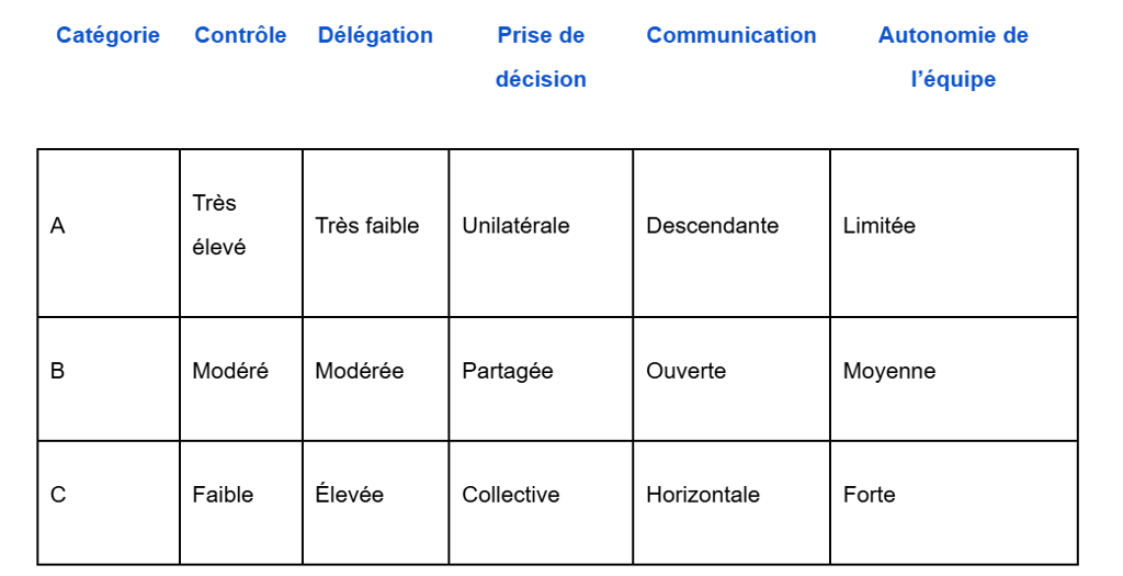 Le classement d’un manager dans l’une de ces trois catégories dépend donc de son degré de contrôle, de sa capacité à déléguer, de son mode de prise de décision, de son style de communication et du niveau d’autonomie qu’il accorde à son équipe. Un manager efficace saura naviguer entre ces styles selon les besoins, mais la tendance dominante permet de le situer sur ce spectre